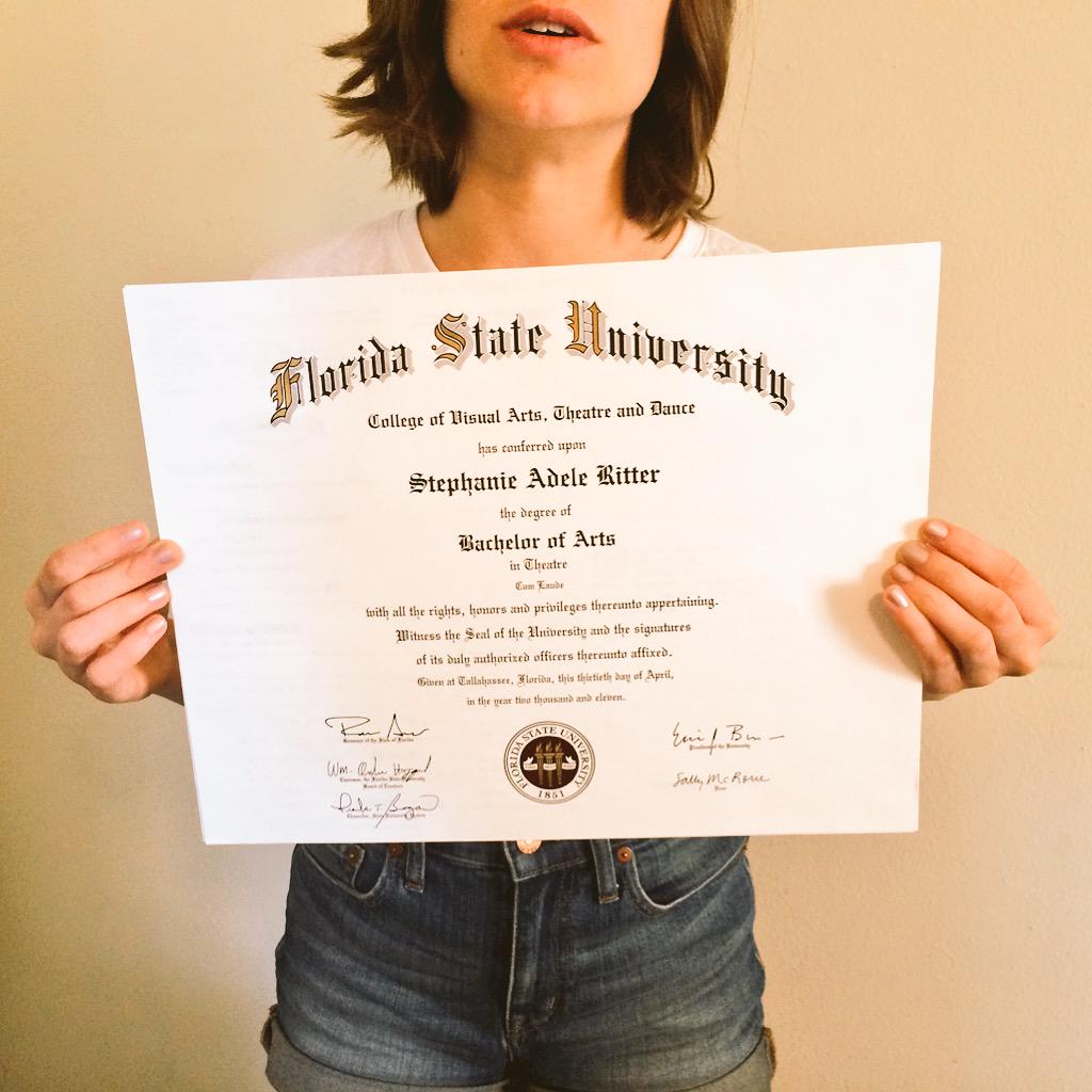Subito dopo aver postato Propositi per l'anno nuovo mi trovo a leggere su Huffingtonpost - sito che adoro e che spesso mi regala gioie infinite - la storia di Stephanie Ritter che, laureatasi alla Florida State University in Teatro - ma guarda il caso - si ritrova con un debito enorme da saldare, circa 40.000 dollari (da loro, è giusto ammetterlo, le tasse universitarie sono una specie di salasso, anche se da noi non scherzano) e per far fronte a questa noia bancaria, ha deciso di mettere all'asta la propria laurea, tanto non le serve a niente, dice. (Per leggere la storia di Stephanie andate qui.)